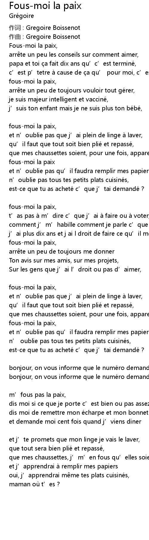 | Fousmoi la paix, | |