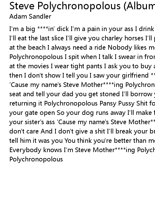 I'm a big ****in' dick I'm a pain in your ass I drink all your beer I'll eat the last slice I'll give you charley horses I'll pull your shorts down at the beach I always need a ride Nobody likes me My name's Steve Mother****ing Polychronopolous I spit when I talk I swear in front of your mother I throw shit at the movies I wear tight pants I ask you to buy an extra Yankee ticket And then I don't show I tell you I saw your girlfriend ****ing two guys at a party 'Cause my name's Steve Mother****ing Polychronopolous I'll piss on your toilet seat and tell your dad you get stoned I'll borrow your jacket and never think of returning it Polychronopolous Pansy Pussy Shit for brains Douchebag I'll leave your gate open So your dog runs away I'll make fun of your pimple Then I'll grab your sister's ass 'Cause my name's Steve Mother****ing Polychronopolous And I don't care And I don't give a shit I'll break your brother's stereo And then tell him it was you You think you're better than me Well you're ****ing wrong Everybody knows I'm Steve Mother****ing Polychronopolous Deal with it Polychronopolous |