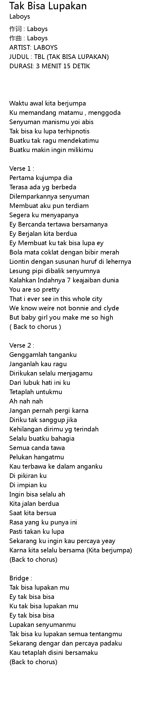 | JUDUL : TBL (TAK BISA LUPAKAN) | |