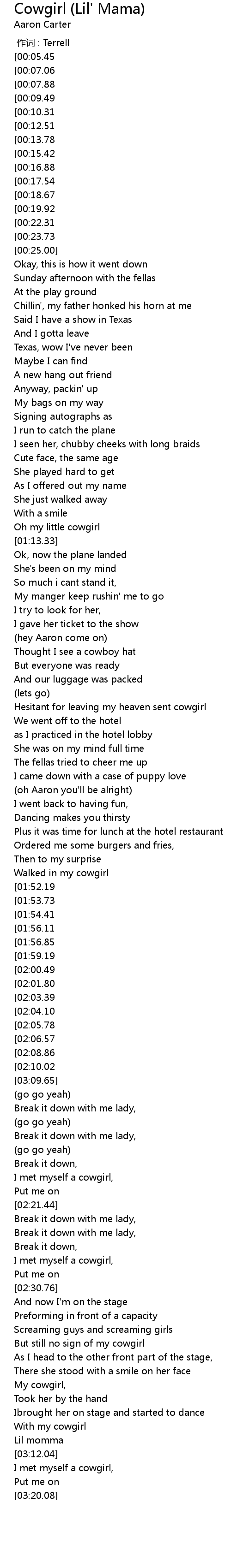 | [01:28.31] | Hesitant for leaving my heaven sent cowgirl |