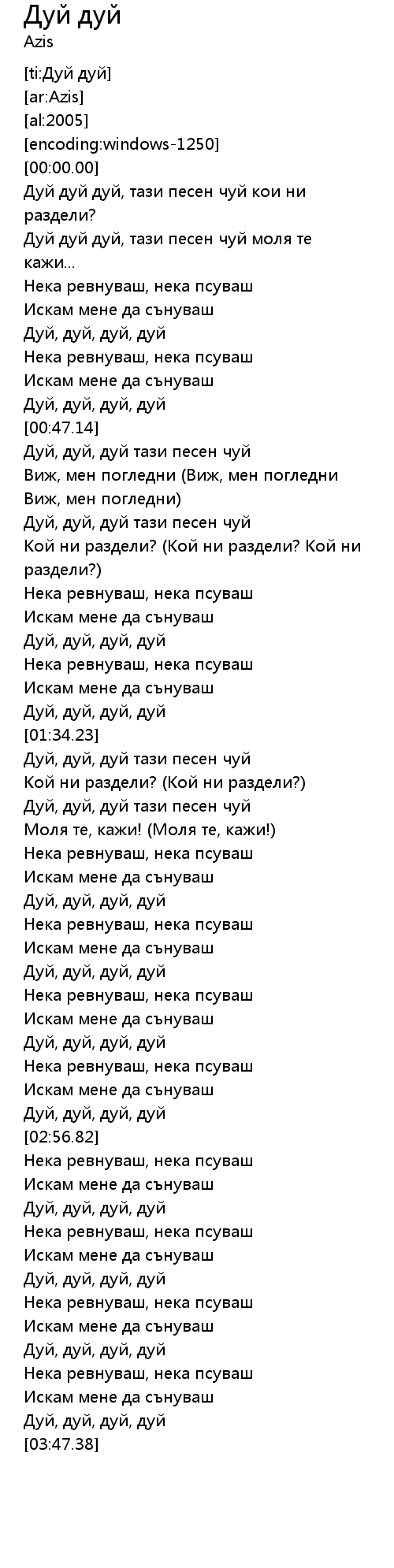 [00:24.15] Дуй дуй дуй, тази песен чуй моля те кажи...