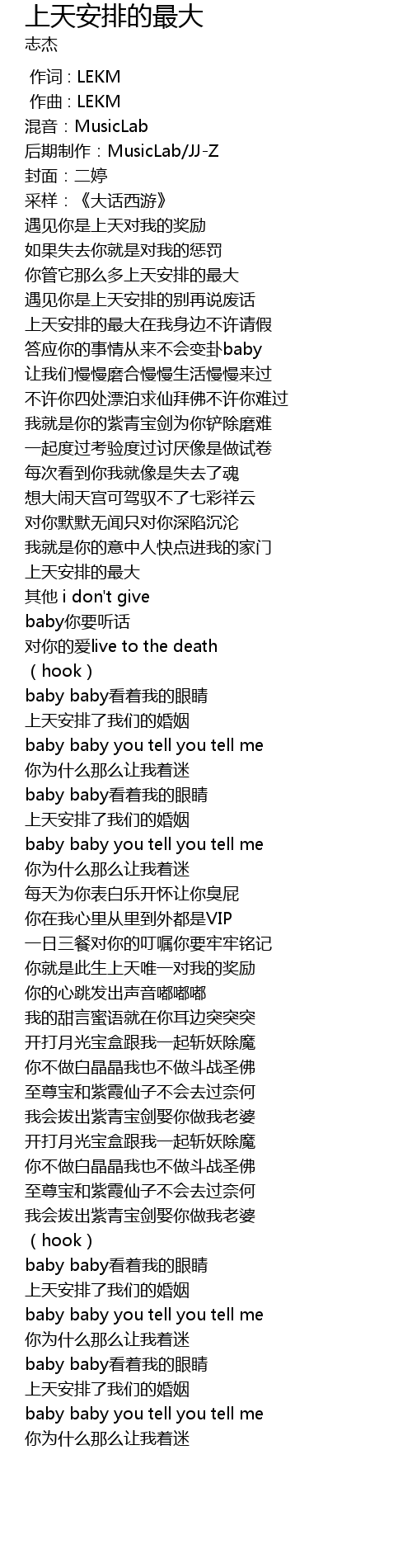 | [00:47.418] | nǐ guǎn tā nà me duō shàng tiān ān pái de zuì dà |