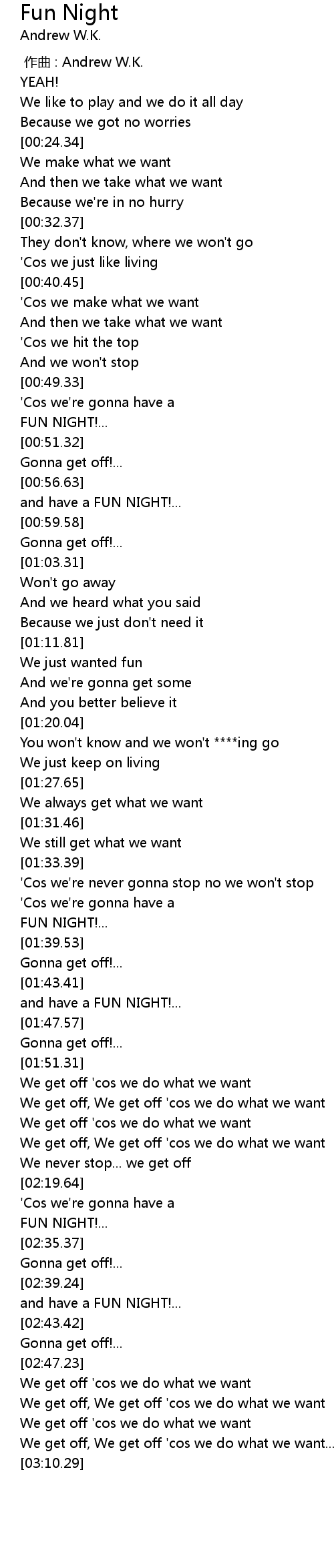 | [03:01.70] | We get off, We get off 'cos we do what we want... Fun Night! |