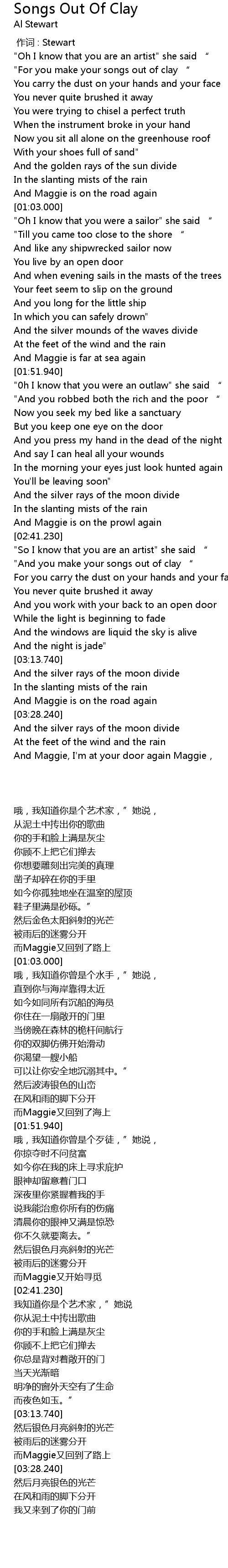 | [00:21.570] | " For you make your songs out of clay " |