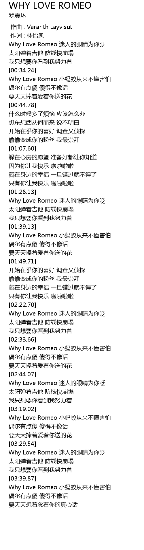 | [00:34.35] | Why Love Romeo xiǎo mǎ yǐ cóng lái bù dǒng hài pà |