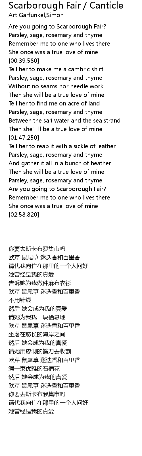 | [02:25.600] | Are you going to Scarborough Fair? |