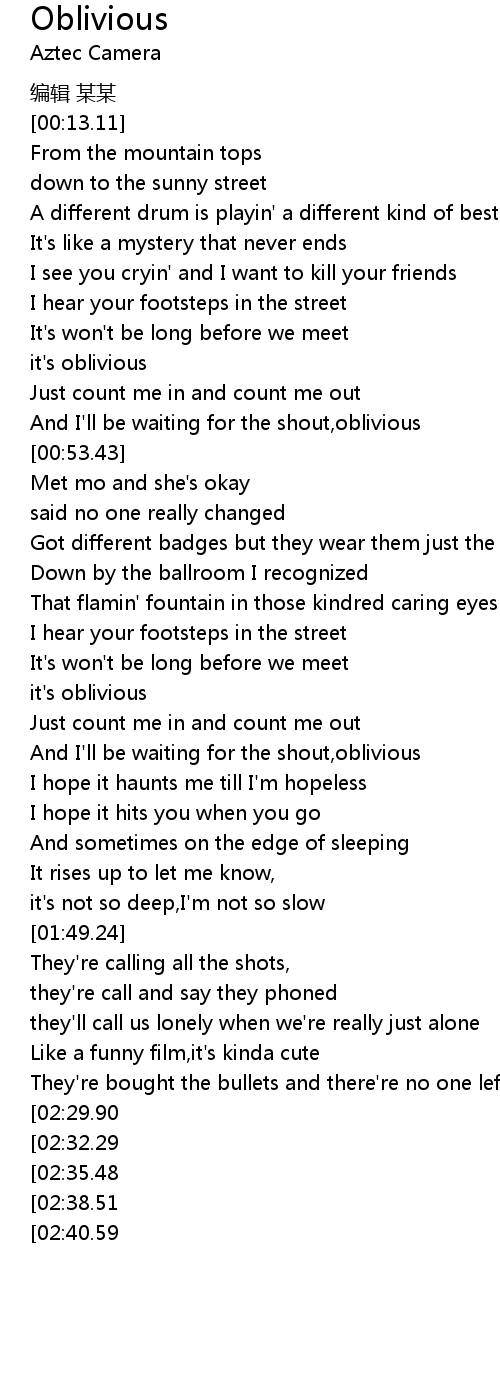 | [02:57.89][02:40.59] | And I' ll be waiting for the shout, oblivious |