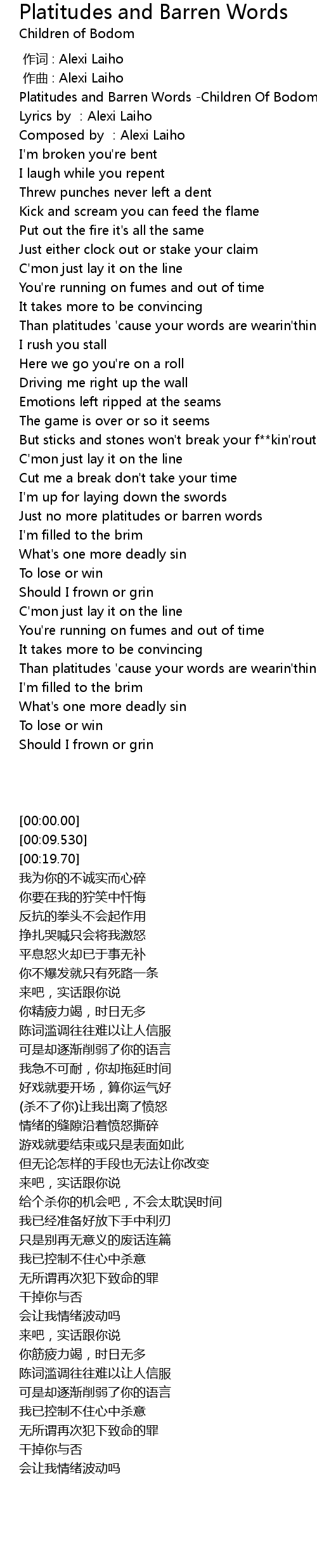 | [00:00.00] | Platitudes and Barren Words Children Of Bodom duo zhi zi |