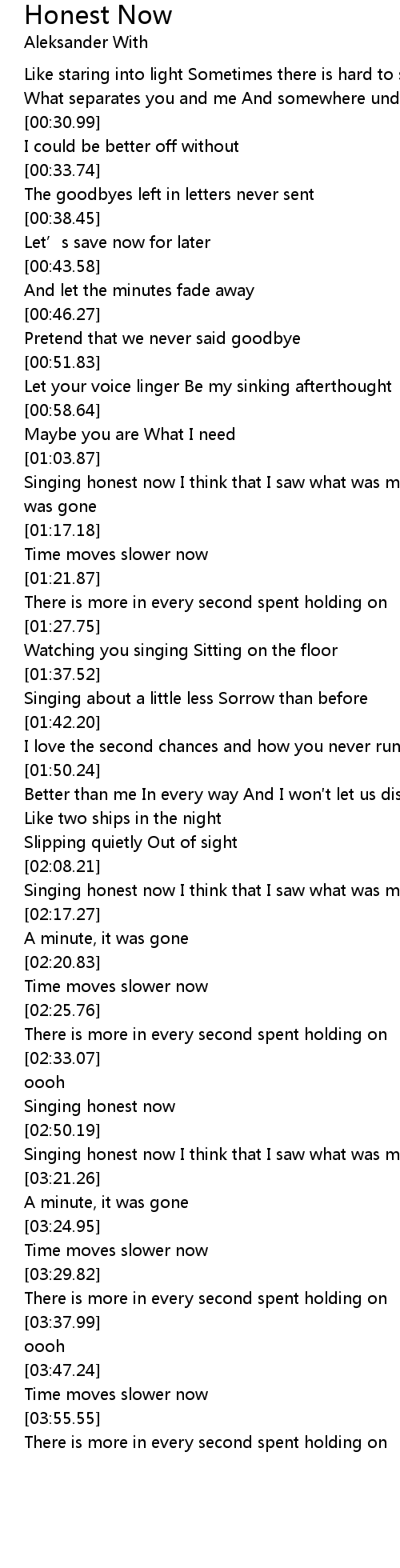 | [01:06.43] | Singing honest now I think that I saw what was missing A minute, it was gone |