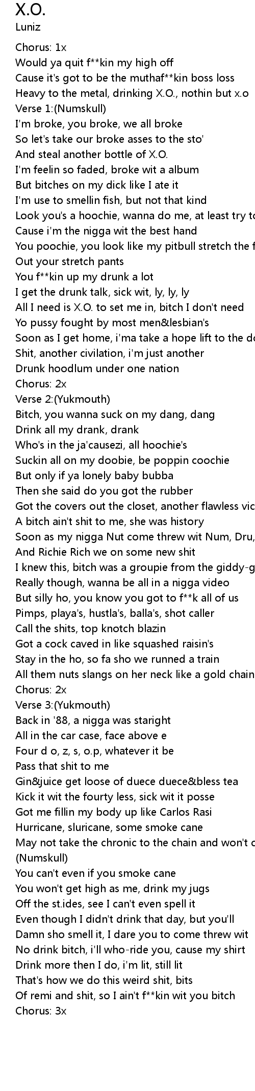 All I need is X.O. to set me in, bitch I don't need |