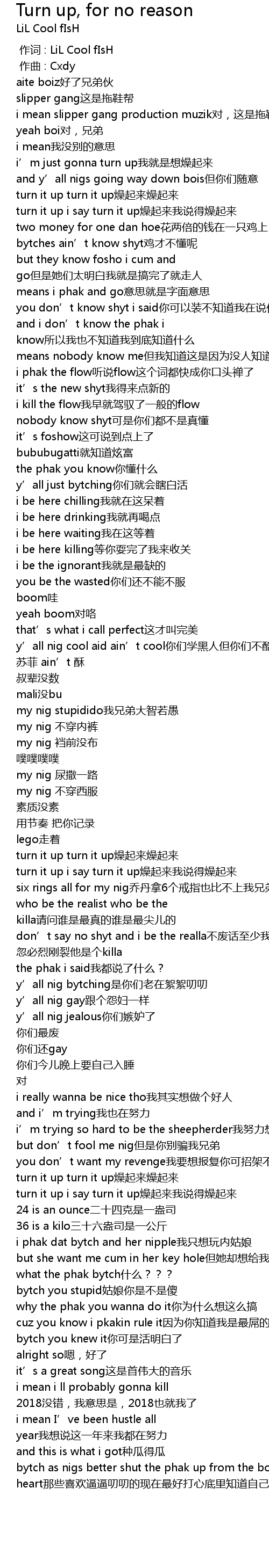 | [01:30.507] | turn it up turn it up zào qǐ lái zào qǐ lái |