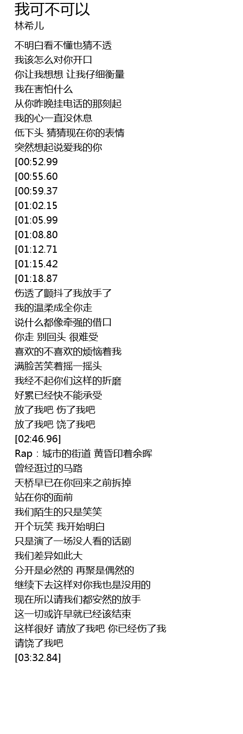 | [02:03.32][00:55.60] | 我可不可以被你再一次爱惜 |