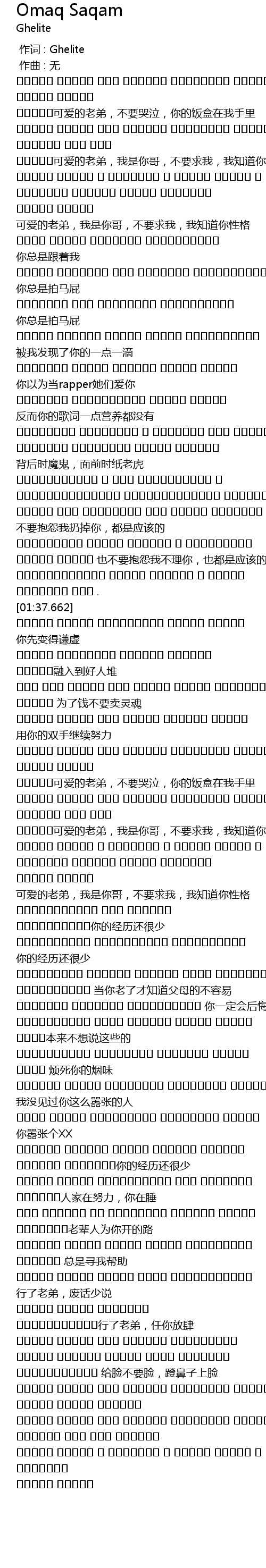 | [01:52.163] | ئوماق ساقام مەن ئاكاڭ، يالۋۇرما بولدى بىلدىم سەن بەك قاشاڭ可爱的老弟,我是你哥,不要求我,我知道你性格 |