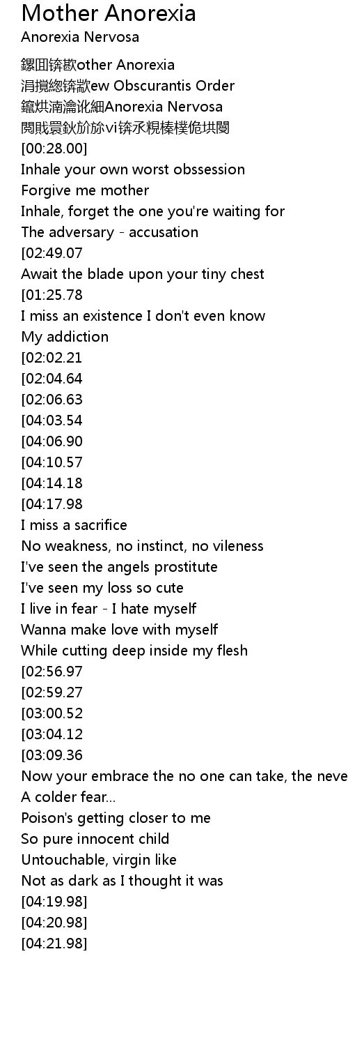 | [01:37.17][04:10.57] | Mother Anorexia, my hope was fake |