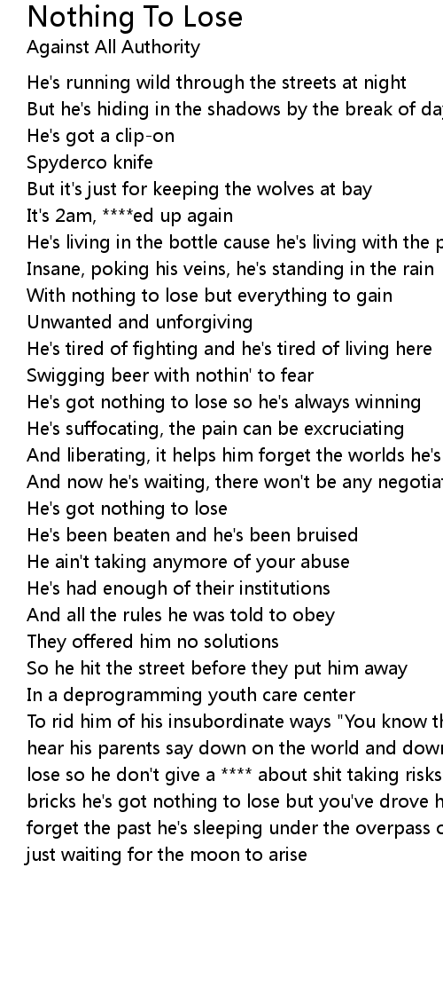 To rid him of his insubordinate ways "You know that boy ain't right" is what you hear his parents say down on the world and down on his luck he's got nothing to lose so he don't give a **** about shit taking risks in the street throwing bricks he's got nothing to lose but you've drove him to this trying hard to forget the past he's sleeping under the overpass of 1-95 just trying to survive just waiting for the moon to arise |