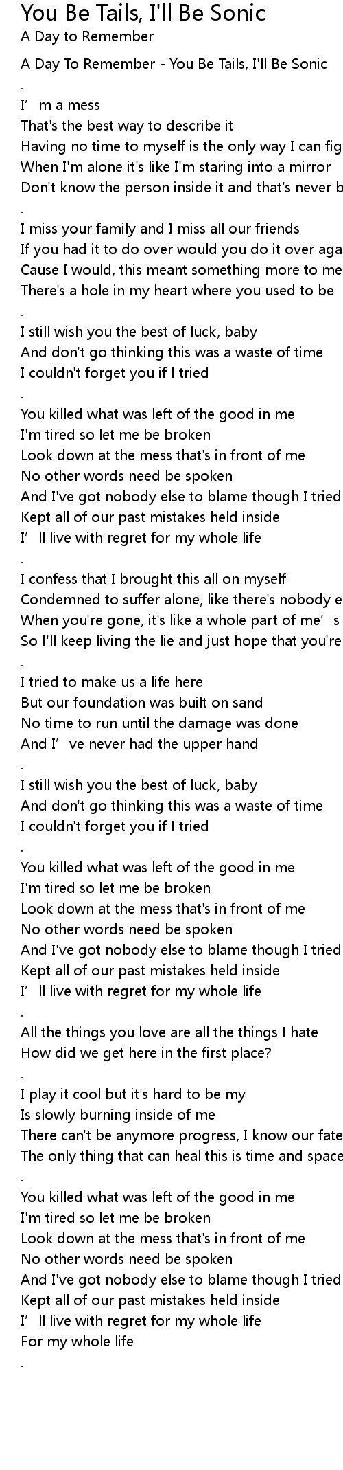 | [00:00.40] | A Day To Remember You Be Tails, I' ll Be Sonic |