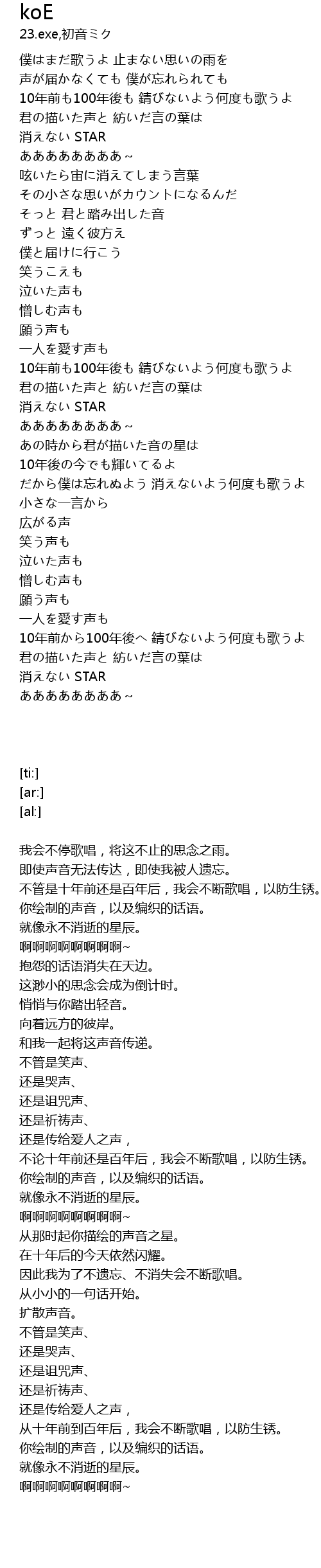 | [00:15.99] | 10年前も100年後も 錆びないよう何度も歌うよ |
