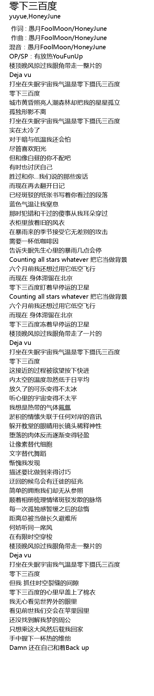 | [00:33.09] | dǎ zuò zài shī mián yǔ zhòu wǒ qì wēn shì líng xià shè shì sān bǎi dù |
