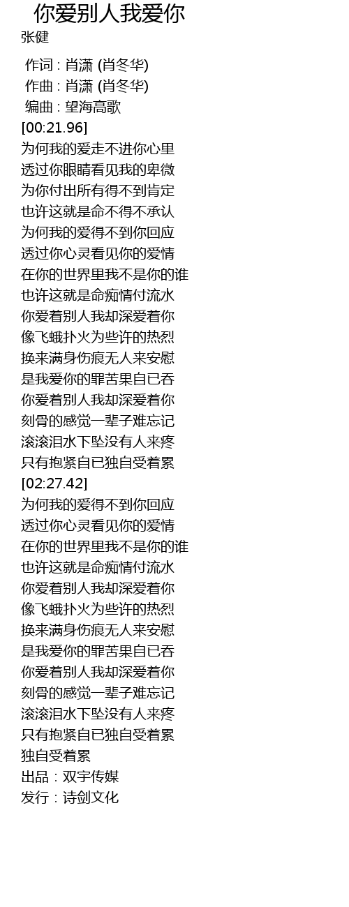 | [01:56.45] | 你爱着别人我却深爱着你 |