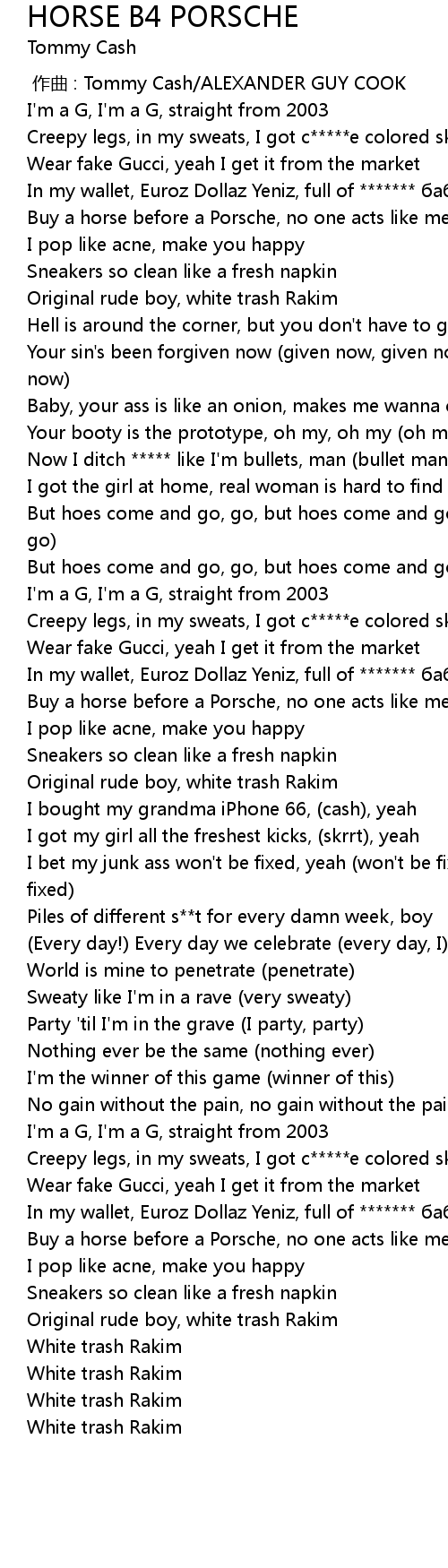 | [01:29.143] | Buy a horse before a Porsche, no one acts like me |