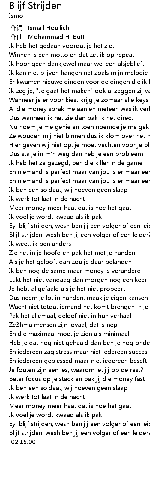 | [02:05.39] | Ey, blijf strijden, wesh ben jij een volger of een leider? |