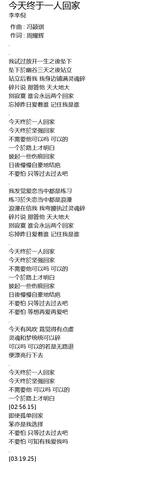 | [01:40.15] | jīn tiān zhōng yú yī rén huí jiā |