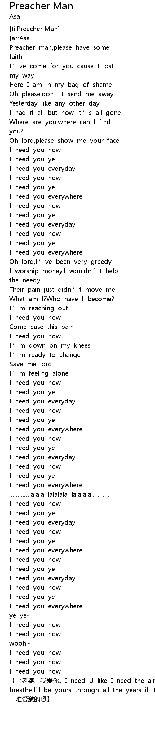 | [00:14.50] | Preacher man, please have some |