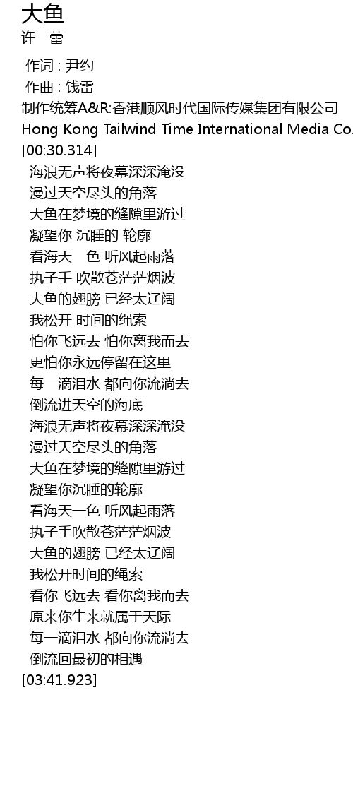 | [02:59.212] | 大鱼的翅膀 已经太辽阔 |