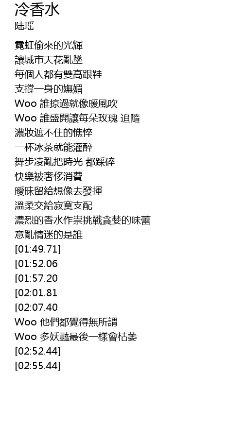 | [02:12.28][01:52.06] | 冷香水 不用別人給自己讚美 |