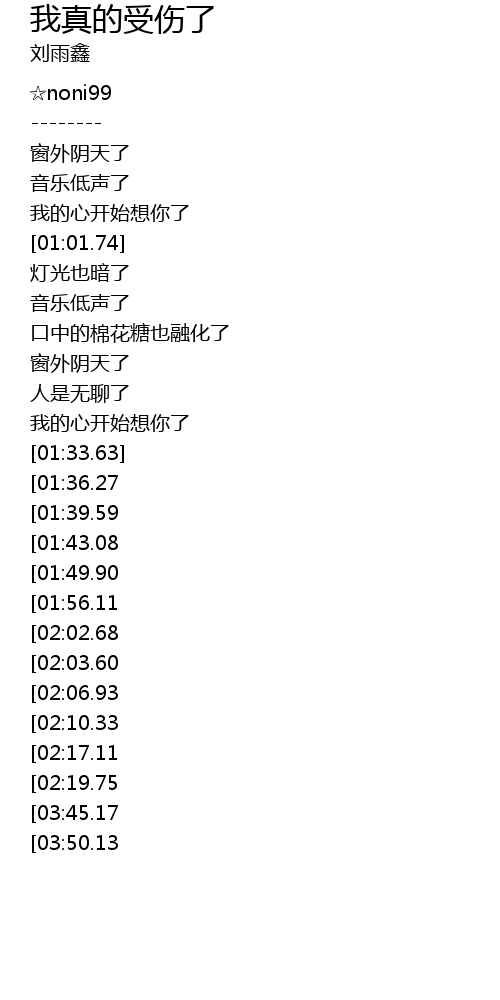 | [03:52.01][03:45.17][02:23.17] | wo de xin zhen de shou shang le |