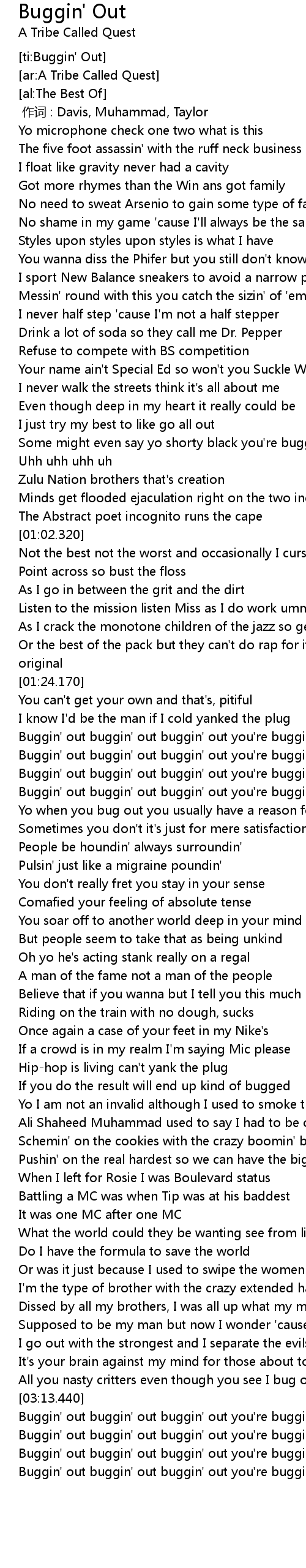 | [01:38.420] | Buggin' out buggin' out buggin' out you're buggin' out |