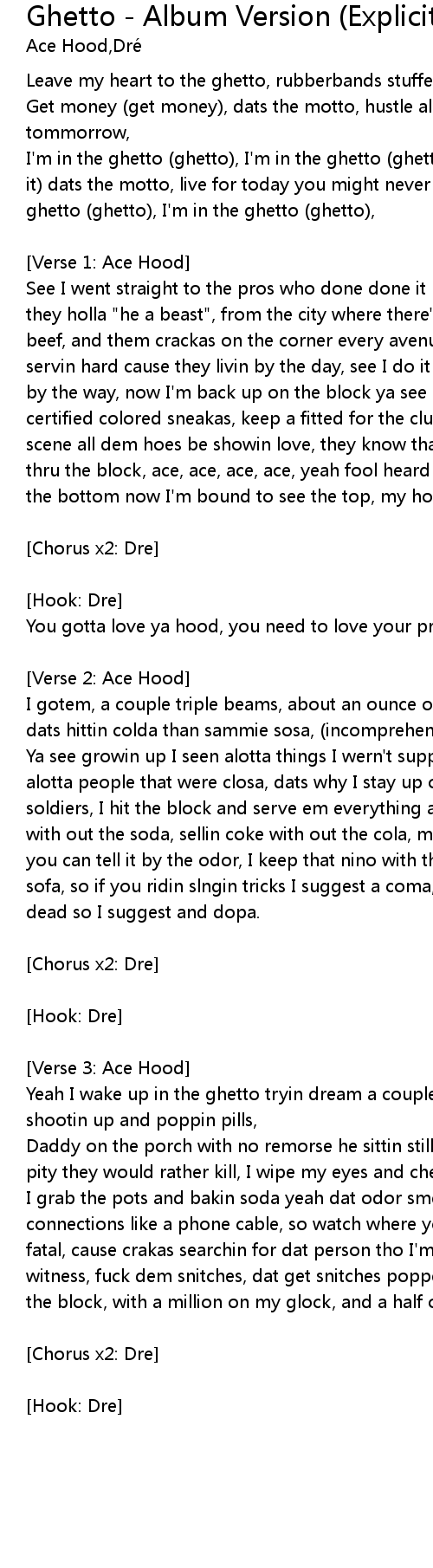 | I'm in the ghetto (ghetto), I'm in the ghetto (ghetto), gotta get it (gotta get it) dats the motto, live for today you might never see tommorow, I'm in the ghetto (ghetto), I'm in the ghetto (ghetto), | |