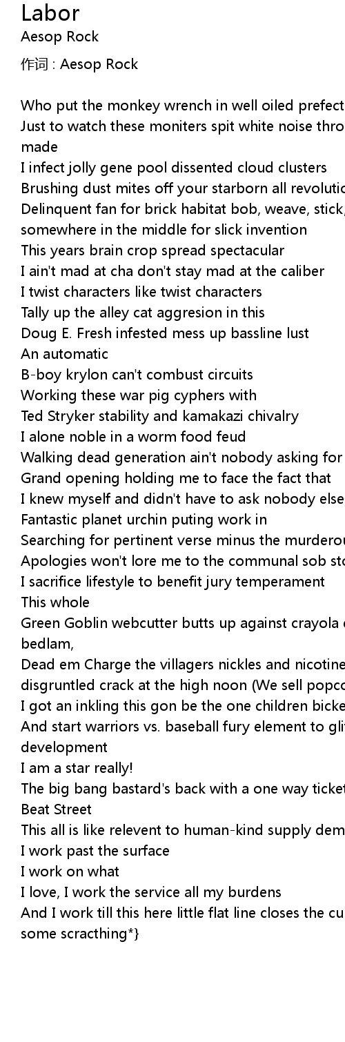 | "This is labor" {*echoes*} {*sample cut and scratched*} [Aesop Rock] | |