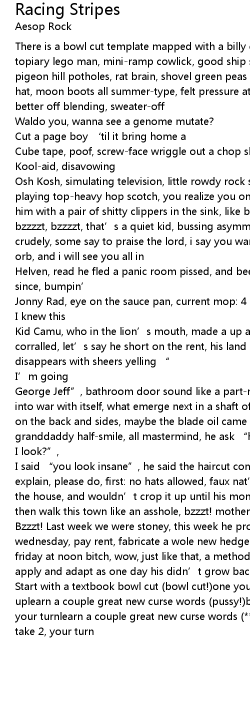 | I said " you look insane", he said the haircut come with a theory i' ll explain, please do, first: no hats allowed, faux nat' male pattern when he out the house, and wouldn' t crop it up until his monopoly prop pass go, ' til then walk this town like an asshole, bzzzt! mother ing bzzzt! | |