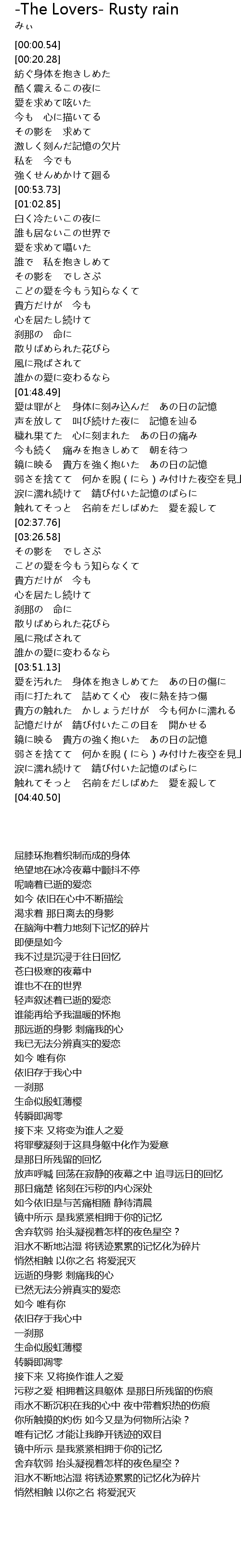 | [04:32.37] | 触れてそっと 名前をだしばめた 愛を殺して |