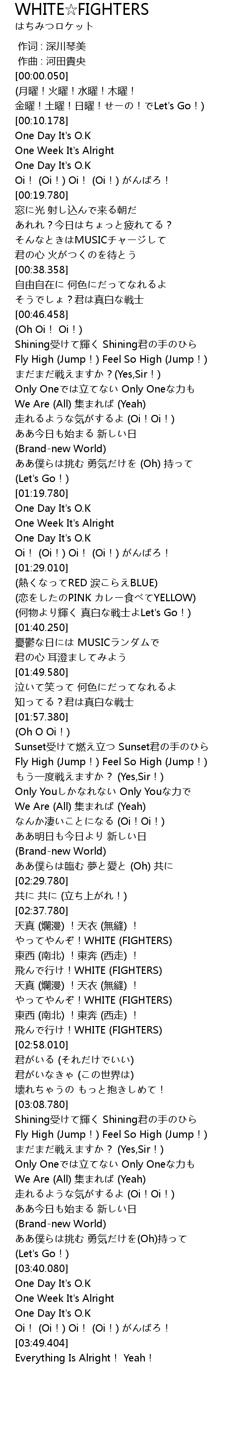 | [02:55.969] | 飛んで行け!WHITE (FIGHTERS) |