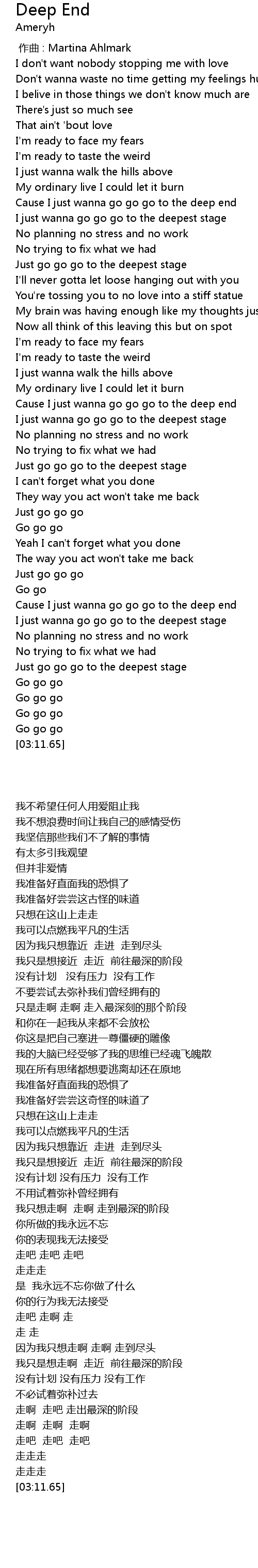 | [00:35.59] | Cause I just wanna go go go to the deep end |