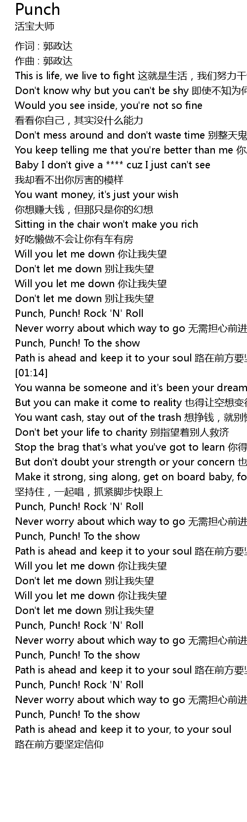 | [01:11] | Path is ahead and keep it to your soul lu zai qian fang yao jian ding xin yang |