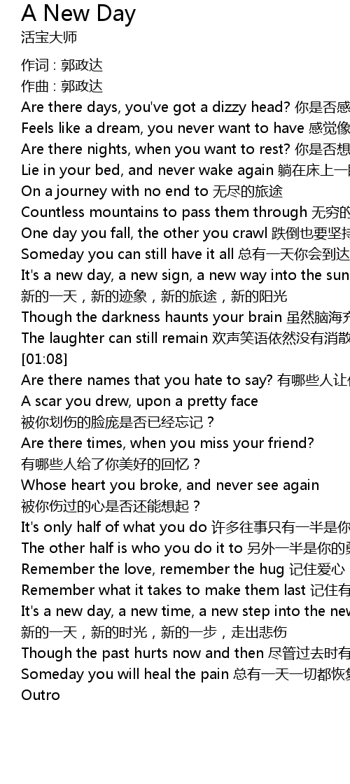 | [02:01] | It' s a new day, a new time, a new step into the new life xin de yi tian, xin de shi guang, xin de yi bu, zou chu bei shang |