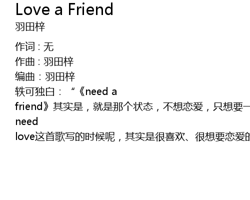 | yì kě dú bái:" need a friend qí shí shì, jiù shì nà gè zhuàng tài, bù xiǎng liàn ài, zhǐ xiǎng yào yí gè péng yǒu. dàn i need love zhè shǒu gē xiě de shí hòu ne, qí shí shì hěn xǐ huān hěn xiǎng yào liàn ài de gǎn jué. jiù shì bù yí yàng de gǎn jué." |