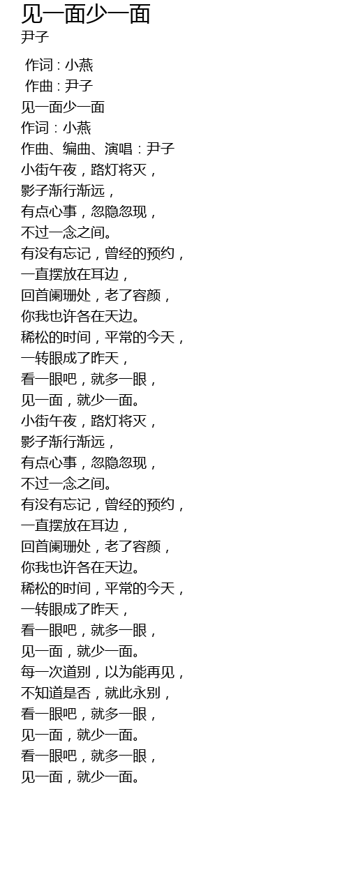 | [03:25.30] | jiàn yī miàn, jiù shǎo yī miàn. |