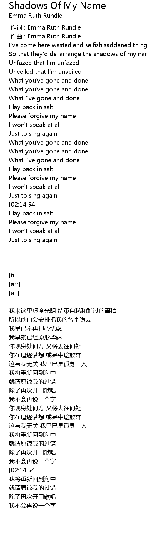 | [00:09.70] | So that they' d dearrange the shadows of my name |