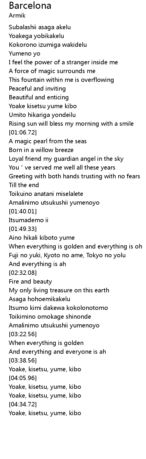 | [01:36.02] | Amalinimo utsukushii yumenoyo |
