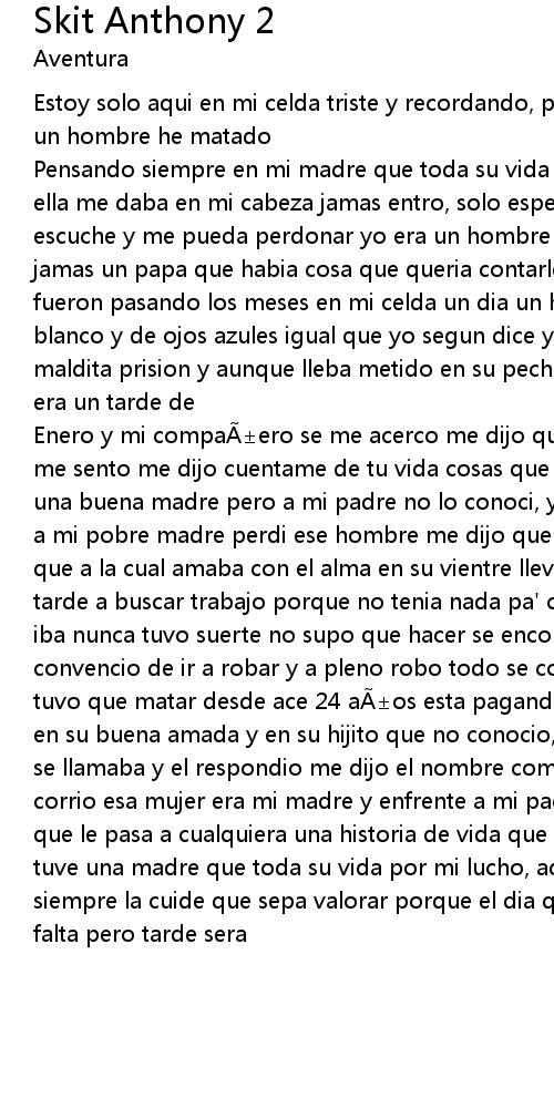 | Enero y mi compa ero se me acerco me dijo quieres que hablemos y a mi lado se me sento me dijo cuentame de tu vida cosas que tenga dentro de ti le dije tuve una buena madre pero a mi padre no lo conoci, y por andar con malas compa ias a mi pobre madre perdi ese hombre me dijo que ace mucho tiempo tenia una mujer que a la cual amaba con el alma en su vientre llevaba un hijo de el, sali una tarde a buscar trabajo porque no tenia nada pa' comer pero a todos los lados que iba nunca tuvo suerte no supo que hacer se encontro con un viejo amigo y lo convencio de ir a robar y a pleno robo todo se complica y un hombre inocente tuvo que matar desde ace 24 a os esta pagando todo su error pensando simpre en su buena amada y en su hijito que no conocio, le pregunte por su amada como se llamaba y el respondio me dijo el nombre completo y un sudor frio por mi corrio esa mujer era mi madre y enfrente a mi padre estaba yo esta la historia que le pasa a cualquiera una historia de vida que me sucedio no tuve padre pero tuve una madre que toda su vida por mi lucho, aquel que tenga una madre que siempre la cuide que sepa valorar porque el dia que ya no la tenga mucho le ara falta pero tarde sera |