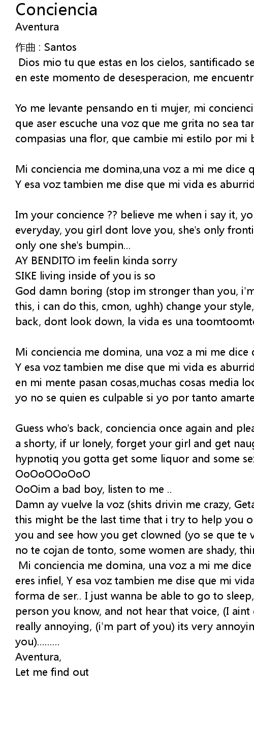 | Damn ay vuelve la voz (shits drivin me crazy, Getaway from me, Get away) now this might be the last time that i try to help you out, its sad to be inside of you and see how you get clowned (yo se que te vuelvo loco pero eso es para que no te cojan de tonto, some women are shady, think twice before you give your heart to a lady [CHORUS:] Mi conciencia me domina, una voz a mi me dice que tuu eres infiel, Y esa voz tambien me dise que mi vida es aburrida y que cambie mi forma de ser.. I just wanna be able to go to sleep, and wake up like a normal person you know, and not hear that voice, (I aint going no where) its really really annoying, (i'm part of you) its very annoying (i'm trying to help you)......... | |