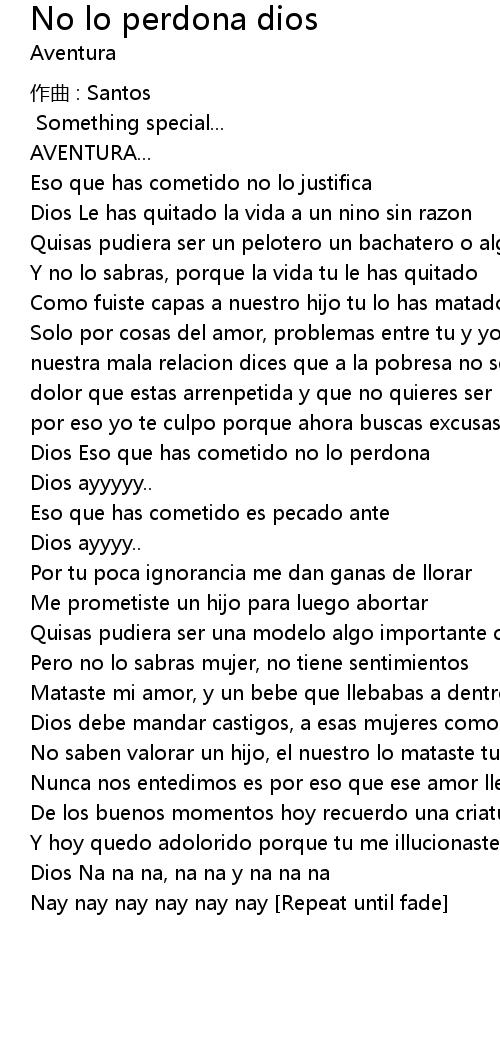 | Solo por cosas del amor, problemas entre tu y yo que culpa tuvo ese nino, de nuestra mala relacion dices que a la pobresa no se trae una creatura a pasar dolor que estas arrenpetida y que no quieres ser la madre de lo que es un error por eso yo te culpo porque ahora buscas excusas no tienes corazon ayyy | |