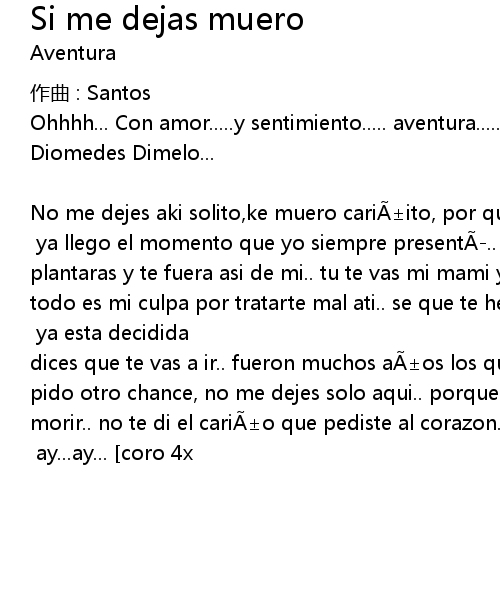 | [2x] ya llego el momento que yo siempre presentÃ.. hay que me plantaras y te fuera asi de mi.. tu te vas mi mami y yo me quedo solo aqui.. y todo es mi culpa por tratarte mal ati.. se que te he fallado y resconosco ahora mi error.. por eso te ruego no me dejes por favor... [coro 2x] ya esta decidida dices que te vas a ir.. fueron muchos años los que ati te hice sufrir.. te pido otro chance, no me dejes solo aqui.. porque si te vas de pena yo voy a morir.. no te di el cariño que pediste al corazon.. y ahora arrepentido te suplico dulce amor.... [coro 2x] ay...ay... [coro 4x] | No me dejes aki solito,ke muero cariñito, por que si tu a me dejas el dolor no lo resisto |