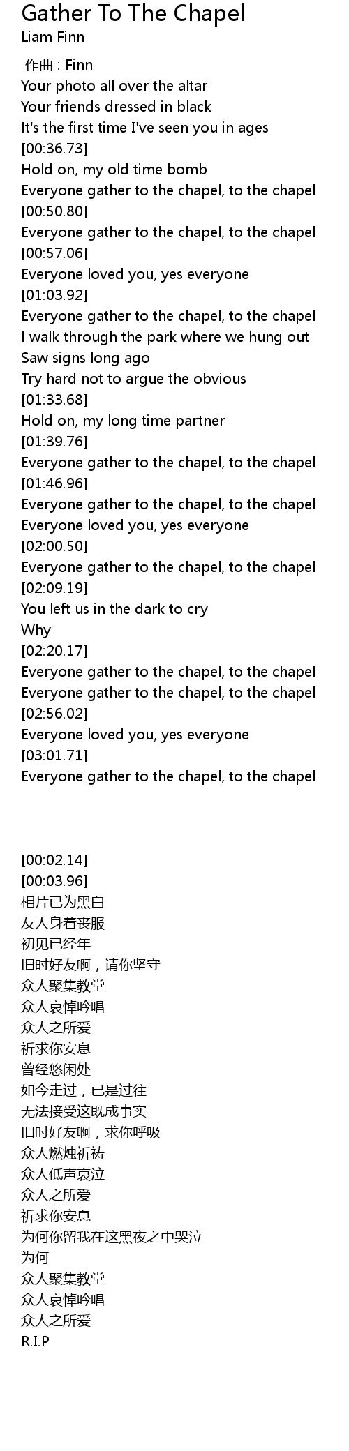 | [03:02.84] | Everyone gather to the chapel, to the chapel |