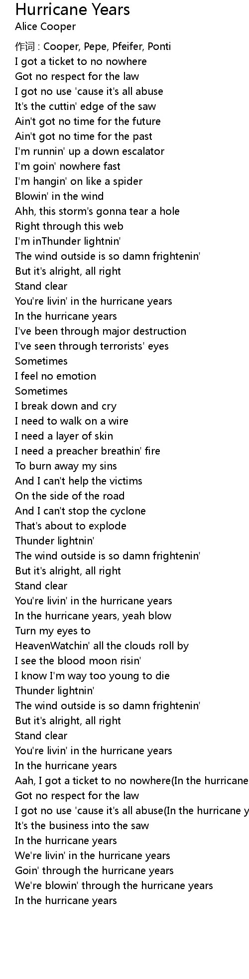 | We're blowin' through the hurricane years | |