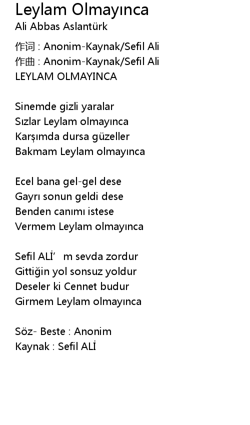| 作词 : Anonim-Kaynak/Sefil Ali | |